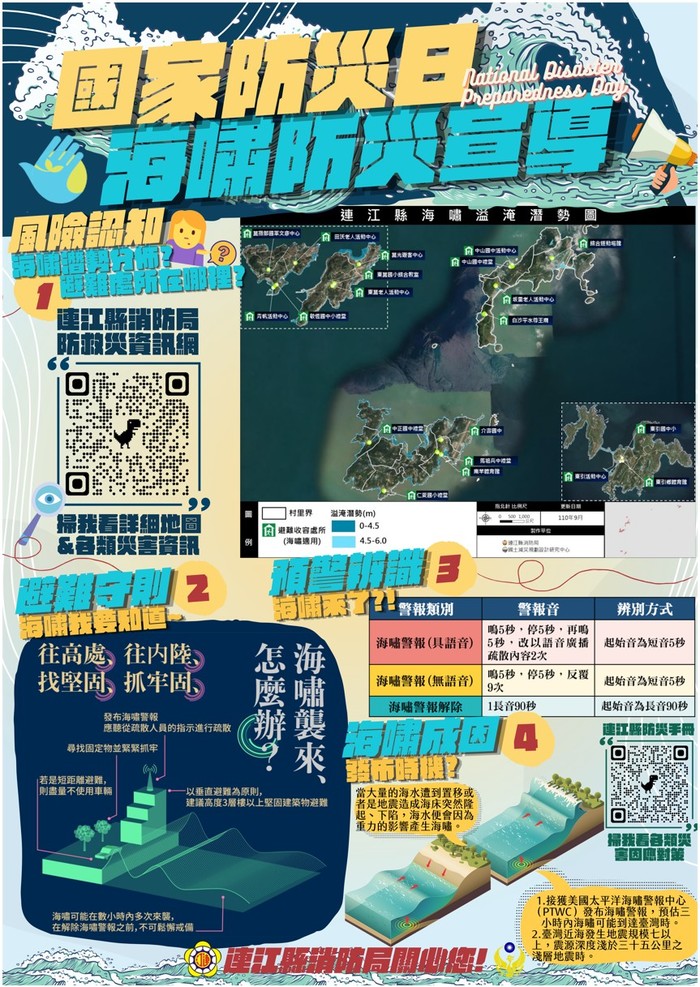 國家防災日 海嘯防災宣導 --閱讀人次 : 627 連江縣消防局配合「110 年國家防災日網路宣導活動實施計畫」加強宣導海嘯風險認知及相關避難知能,藉由掌握強震後連江縣海嘯潛勢分佈區域及四鄉五島海嘯適用之避難場所地圖,了解海嘯來襲時因應對策、辨別警報音及發布時機等重要防災資訊,提升本縣縣民防災意識,臻達全民防災之目的。