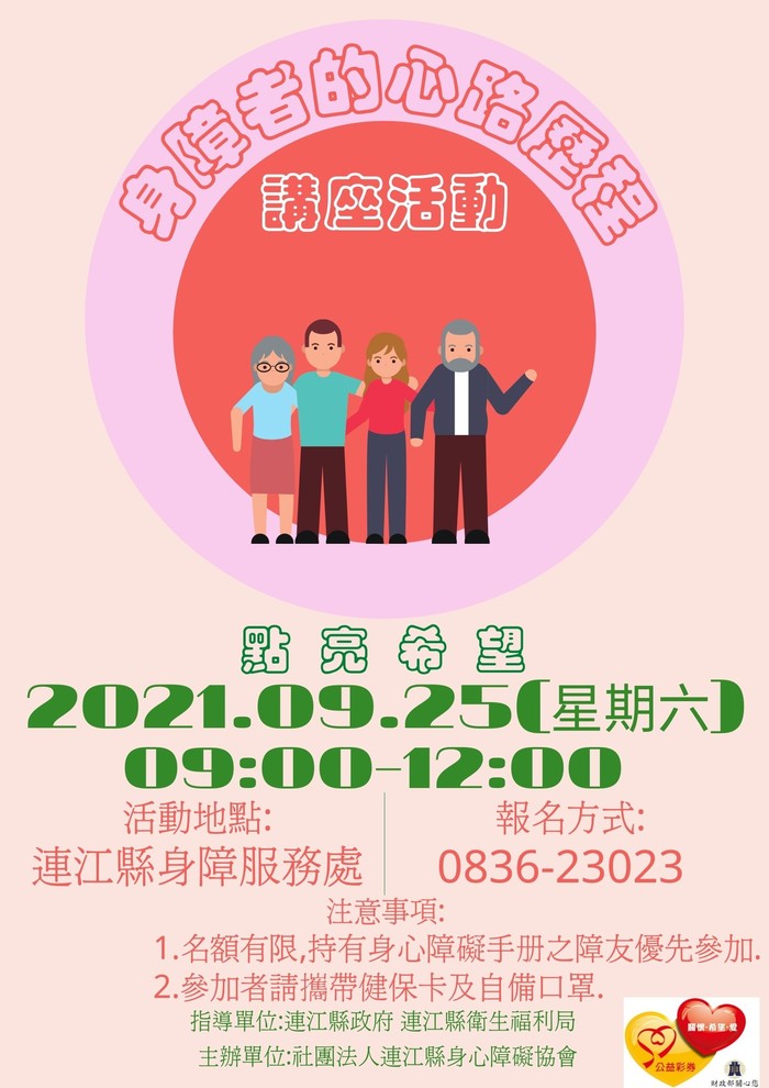 社團法人連江縣身心障礙協會09月25日(星期六)上午09:00時,於連江縣身障服務處舉辦「點亮希望—身障者的心路歷程」講座活動,歡迎報名參加,名額有限,欲報名或有活動相關疑問請來電洽:0836-23023