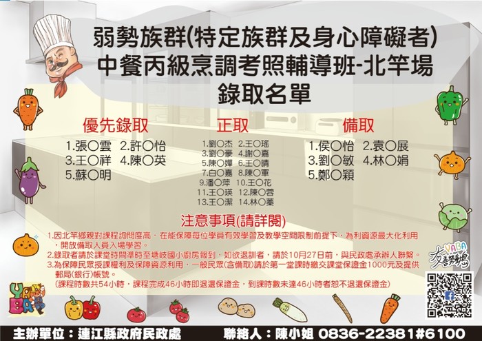 弱勢族群中餐丙級證輔導班-錄取名單