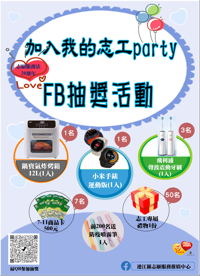 FB抽獎活動 最後一個禮拜~參加就有禮 --閱讀人次 : 887 連江縣慶祝志願服務法施行屆滿20週年