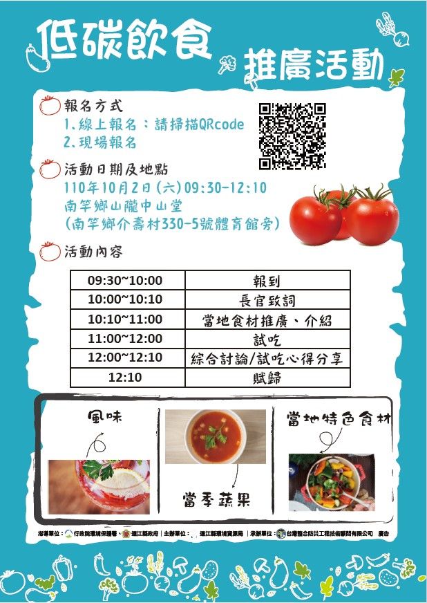 10/2環資局低碳好食推廣活動開動! --閱讀人次 : 1045 環資局於10/2(六)上午9點30分在南竿鄉山隴中山堂辦理低碳飲食推廣活動。