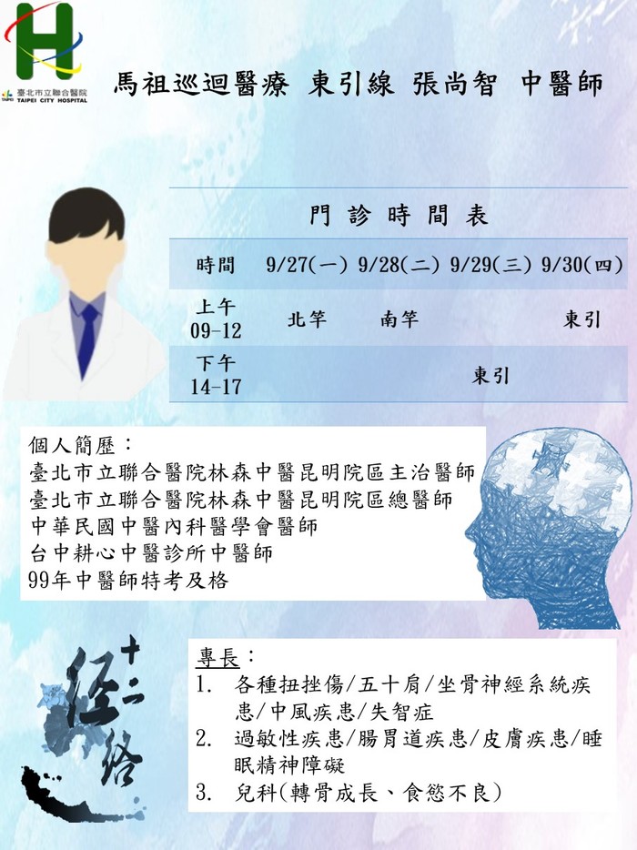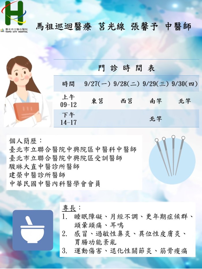 馬祖中醫巡迴醫療服務09/27-30,由東引線 張尚智醫師、莒光線 張馨予醫師前往支援,若有身心健康相關疑問,可前往諮詢,請大家多多利用,看診時記得全程戴口罩喔!
