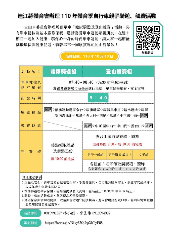 自由車親子騎遊及競賽~報名倒數~ --閱讀人次 : 733 自由車委員會辦理馬祖單車「健康騎遊及登山競賽」活動,另有單車健檢及基本維修保養,邀請喜愛單車運動鄉親朋友,在雙十節日一起加入健康、環保於一身的時尚單車運動,讓大家一起節能減碳環保與健康促進,騎著單車一同欣賞馬祖的山海景致!