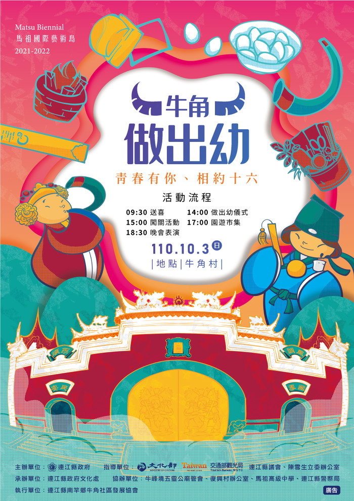 2021年馬祖秋慶牛角做出幼即將登場 --閱讀人次 : 1034 馬祖秋慶系列活動首部曲「鐵板燒塔節」在9月25日圓滿成功畫下句點,接下來10月3日即將登場的是馬祖秋慶系列活動二部曲「牛角做出幼」,係由連江縣政府主辦,並與牛角社區發展協會、牛峰境五靈公廟管理委員會共同籌劃「牛角做出幼」活動。