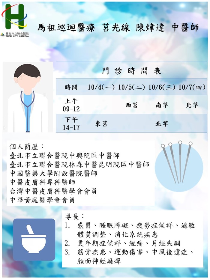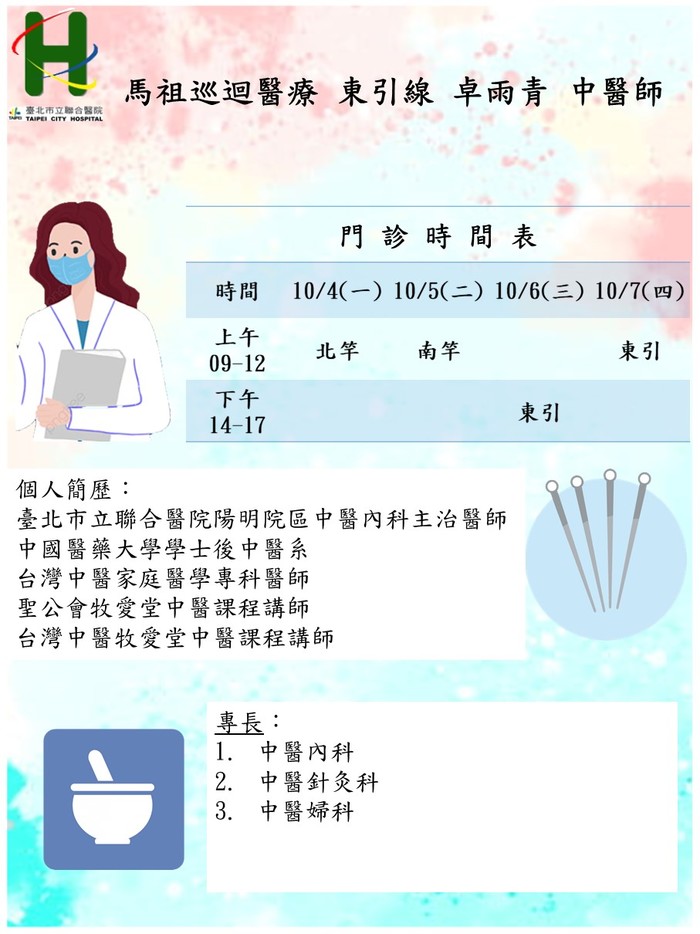 馬祖中醫巡迴醫療服務10/04-07由東引線 卓雨青醫師、莒光線 陳煒達醫師前往支援,請大家多多利用,看診時記得全程戴口罩喔!