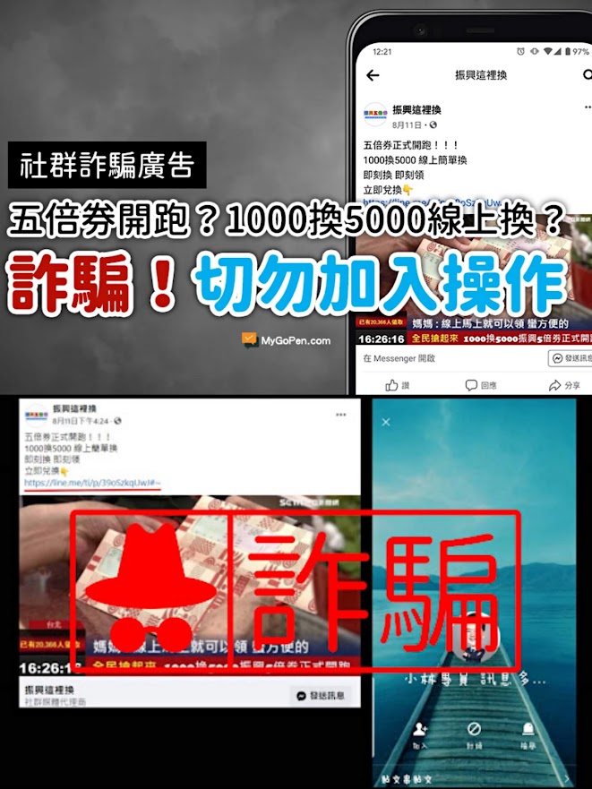 歹徒使用3種詐騙手法.包含假網路拍賣.釣魚簡訊.解除分期付款等。若在網路社群平台發現有人貼文提及可協助預購五倍券.只要付少許金錢.就能賺更多費用.但要先匯款.這就是假網拍真詐騙。