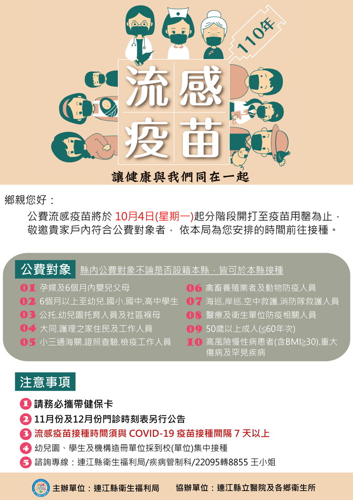 流感疫苗接種時間須與COVID-19疫苗間隔7天以上。