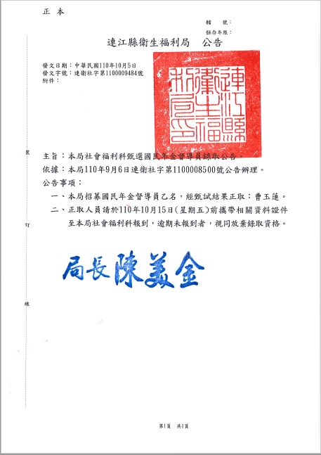 衛福局徵選國民年金督導員錄取公告