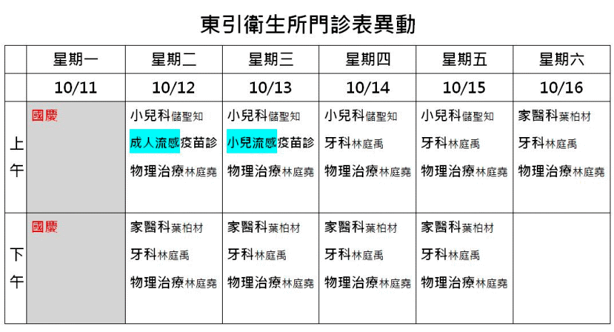 東引衛生所10/12-16門診表