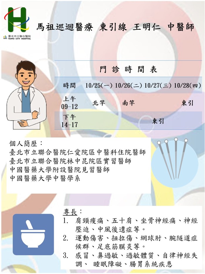 馬祖中醫巡迴醫療服務10/25-28由東引線 王明仁醫師、莒光線 魏任宣醫師前往支援,請大家多多利用,看診時記得全程戴口罩喔!