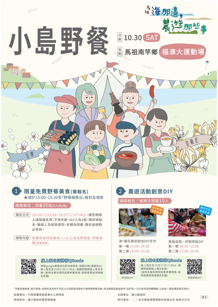 在視野遼闊、海景綠地的福澳運動場草地,為迎接深秋的到來,代表馬祖地區農漁產業一年豐富的發展與美味;因此連江縣政府產業發展處期待與鄉親及來馬的遊客同歡,接續去年的口碑與鄉親的期待,辦理了第二屆的小島野餐活動,在野餐料理上除了享受馬祖文化特色農食的美味體驗,期間會場除了小島闖關遊戲之外還有「農遊DIY活動」以及「聽海的歌-不插電演唱會」,在歡欣舞動的氛圍之下,呈現馬祖鄉村農遊的歡樂特色與愉快舒適的樂活體驗。