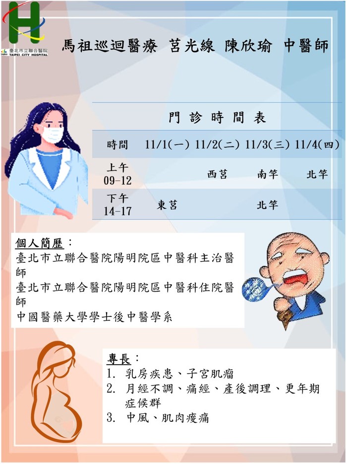 馬祖中醫巡迴醫療服務11/01-04由東引線 宋宛庭醫師、莒光線 陳欣瑜醫師前往支援,請大家多多利用,看診時記得全程戴口罩喔!