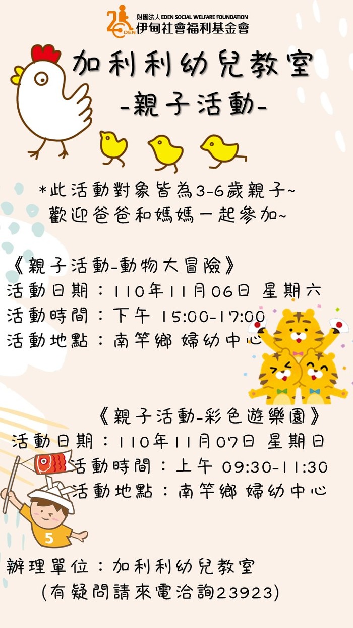 活動取消!加利利活動~11/6.7南竿 --閱讀人次 : 798 各位家長晚安~~邀請幼兒家長帶小朋友一起來參與親子活動~~~~