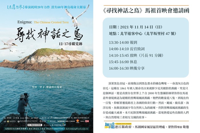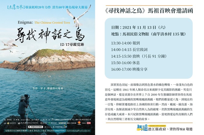 本片耗時20年力作,讓消失60年神話之鳥現身大銀幕,機會難得,謹邀馬祖鄉親闔家蒞臨觀賞。