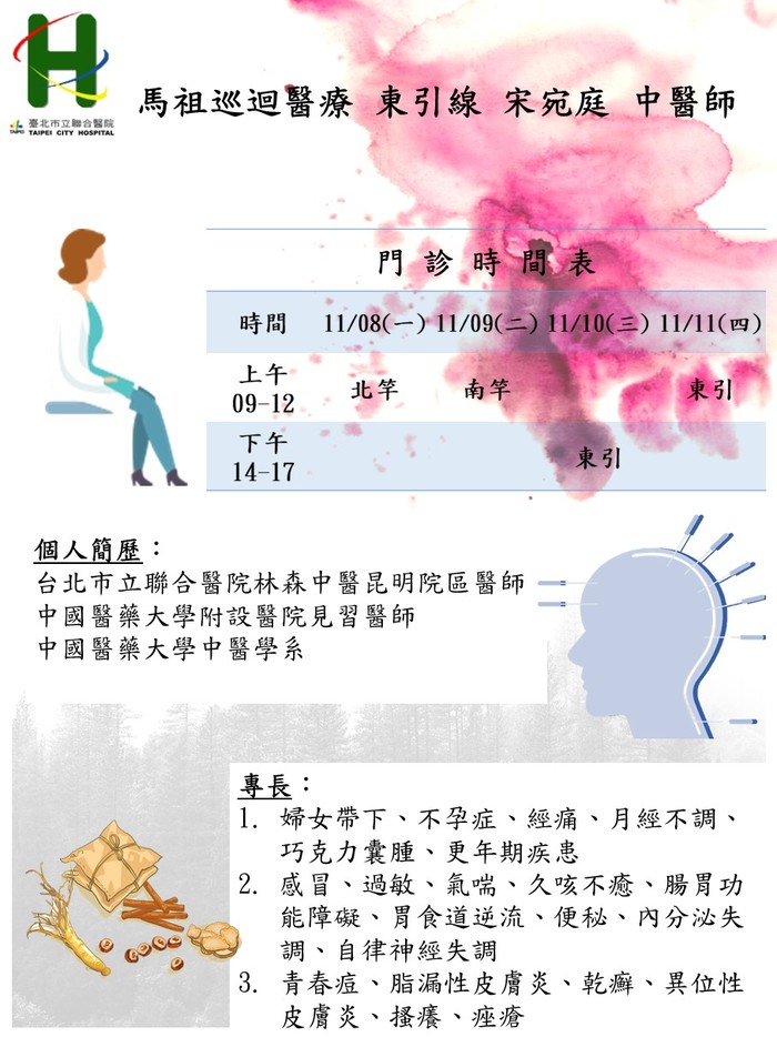馬祖中醫巡迴醫療服務11/08-11由東引線 宋宛庭醫師、莒光線 陳煒達醫師前往支援,請大家多多利用,看診時記得全程戴口罩喔!