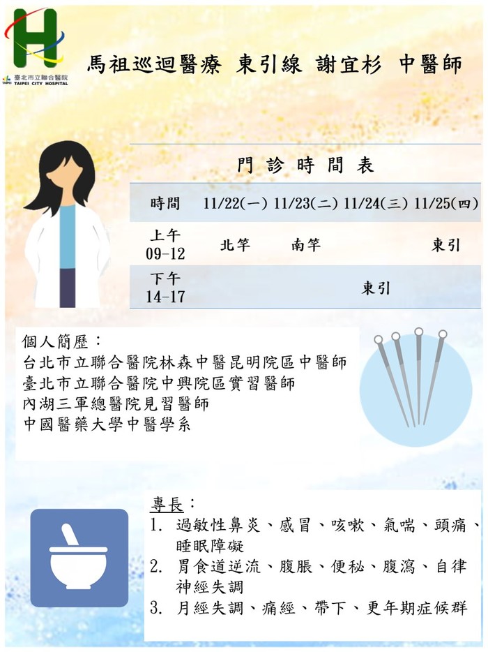 馬祖中醫巡迴醫療服務11/22-25由東引線 謝宜杉醫師、莒光線 宋宛庭醫師前往支援,請大家多多利用,看診時記得全程戴口罩喔!