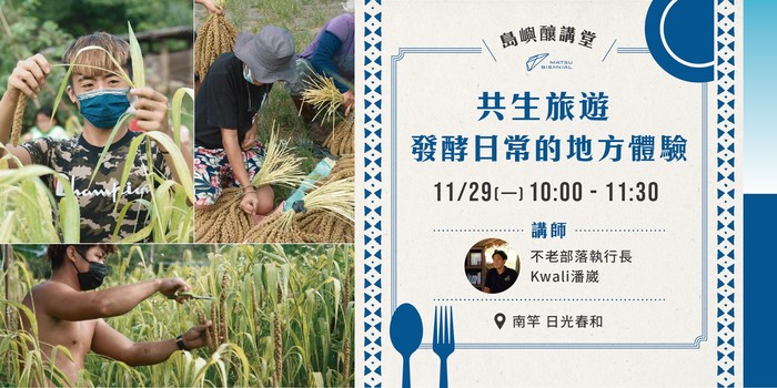 11/29「共生旅遊」分享歡迎參加 --閱讀人次 : 791 歡迎大家下禮拜一 11/29(一) 早上10:00,來日光春和品嚐茶點聽講座,跟宜蘭寒溪鄉不老部落執行長 Kwali 潘崴聊聊 #共生旅遊 和未來旅遊的可能性!