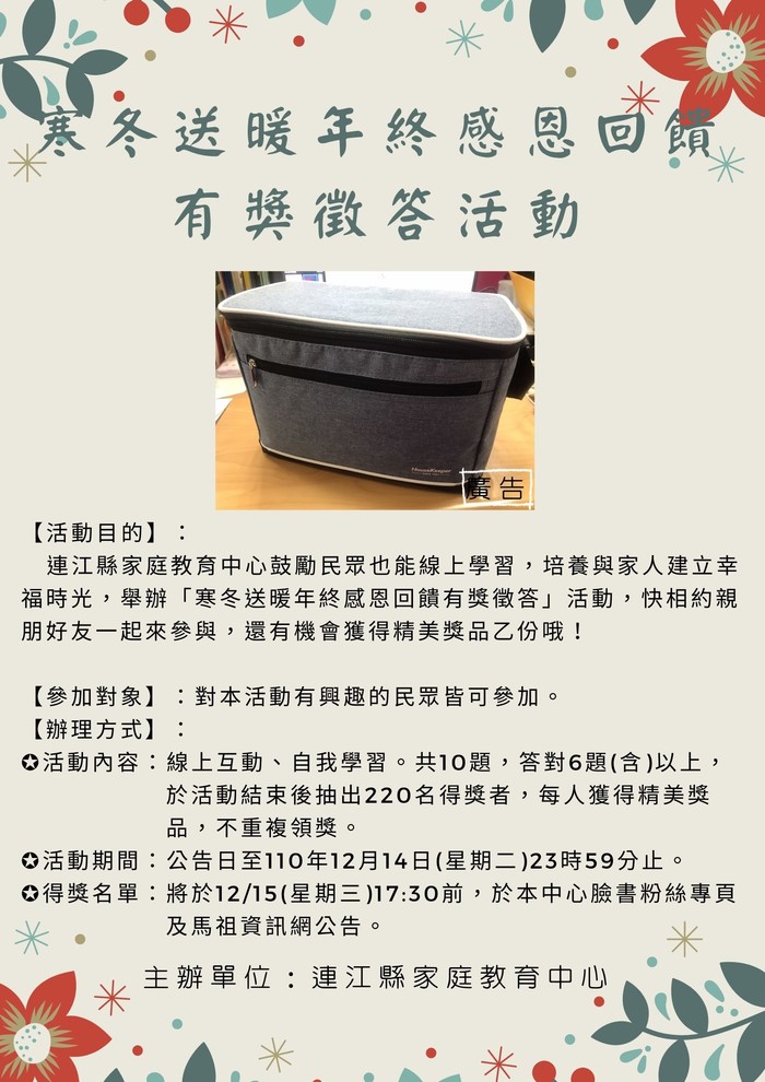連江縣家庭教育中心鼓勵民眾也能線上學習,培養與家人建立幸福時光,舉辦「寒冬送暖年終感恩回饋有獎徵答」活動,快相約親朋好友一起來參與,還有機會獲得精美獎品乙份哦!
