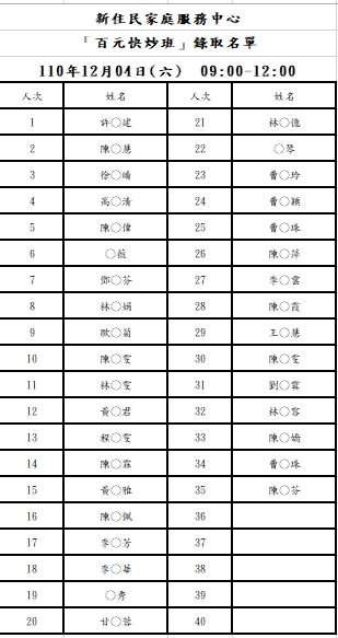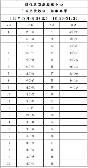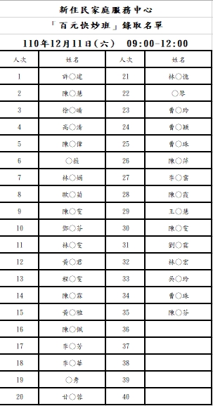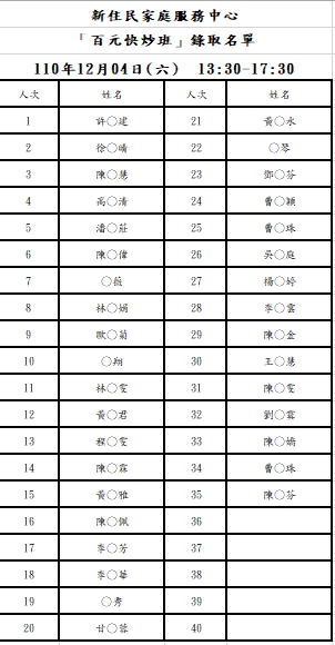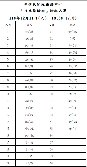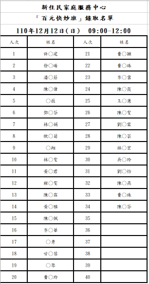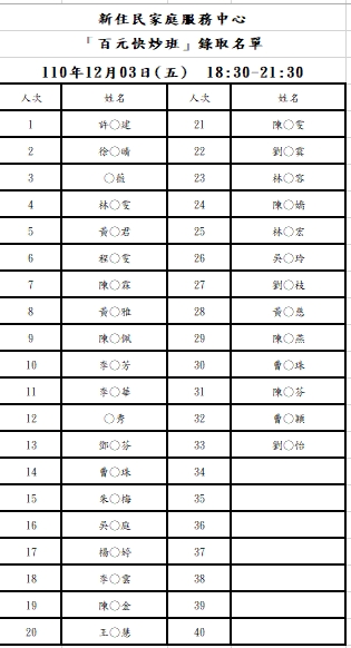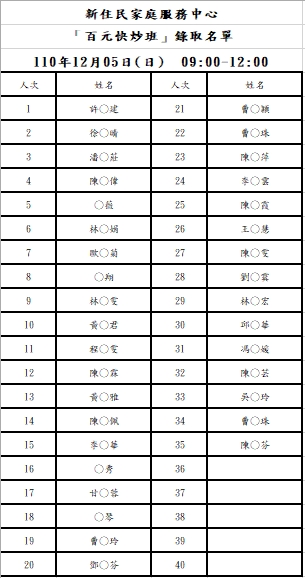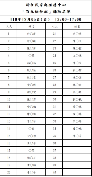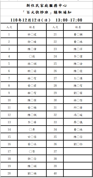 新住民中心「百元快炒」錄取名單