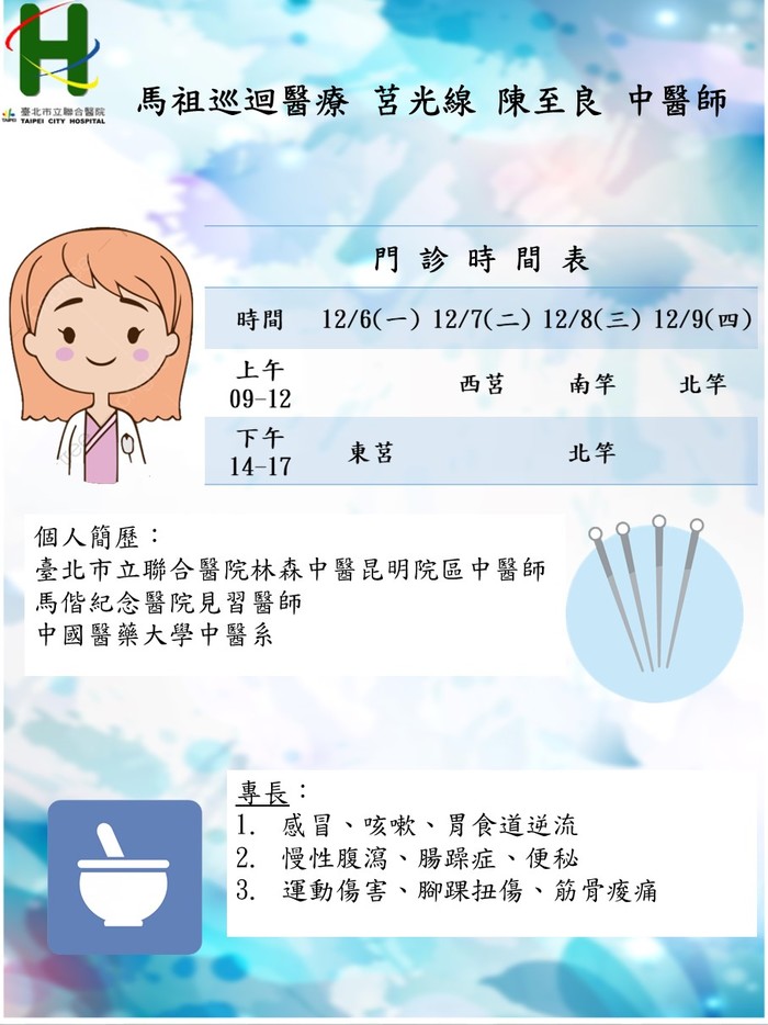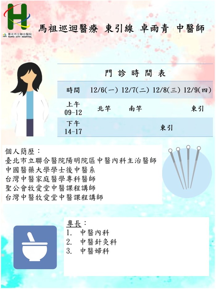 馬祖中醫巡迴醫療服務12/06-12/09由東引線 卓雨青醫師、莒光線 醫師前往支援,請大家多多利用,看診時記得全程戴口罩喔!
