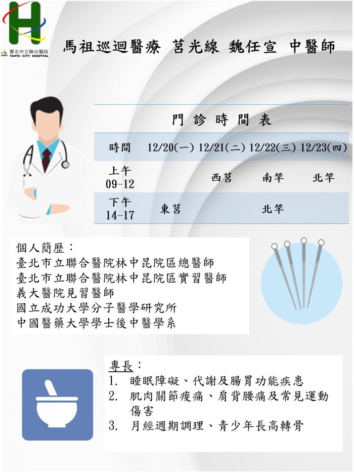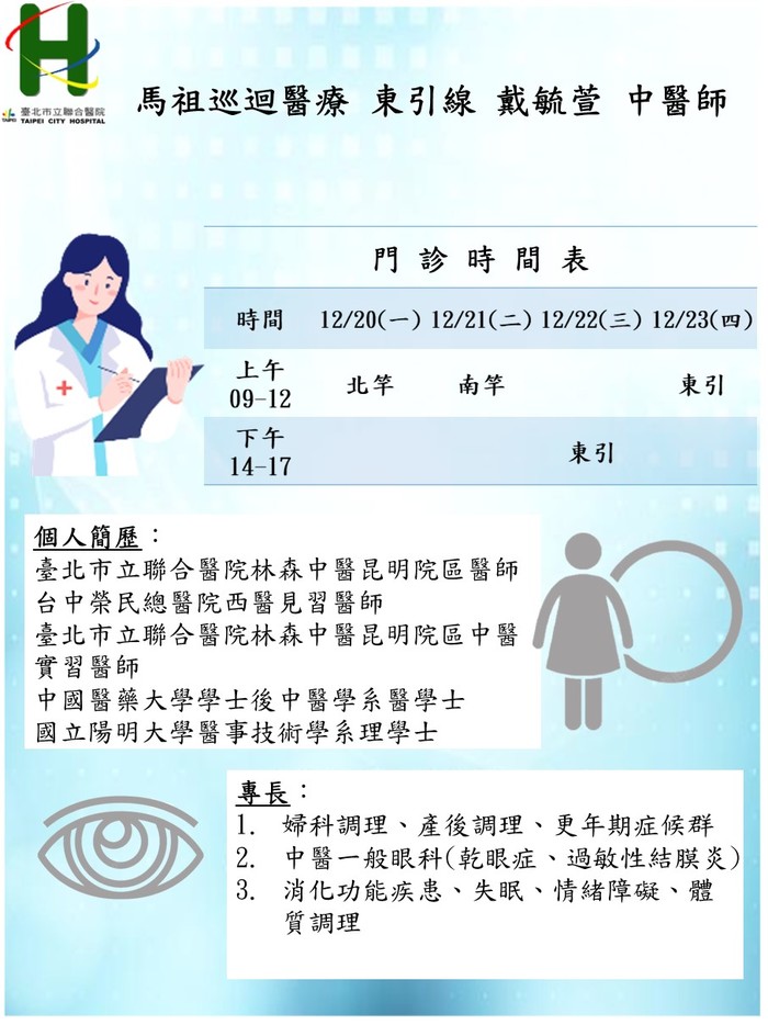 馬祖中醫巡迴醫療服務12/20-12/23由東引線 戴毓萱醫師、莒光線 魏任宣醫師前往支援,請大家多多利用,看診時記得全程戴口罩喔!