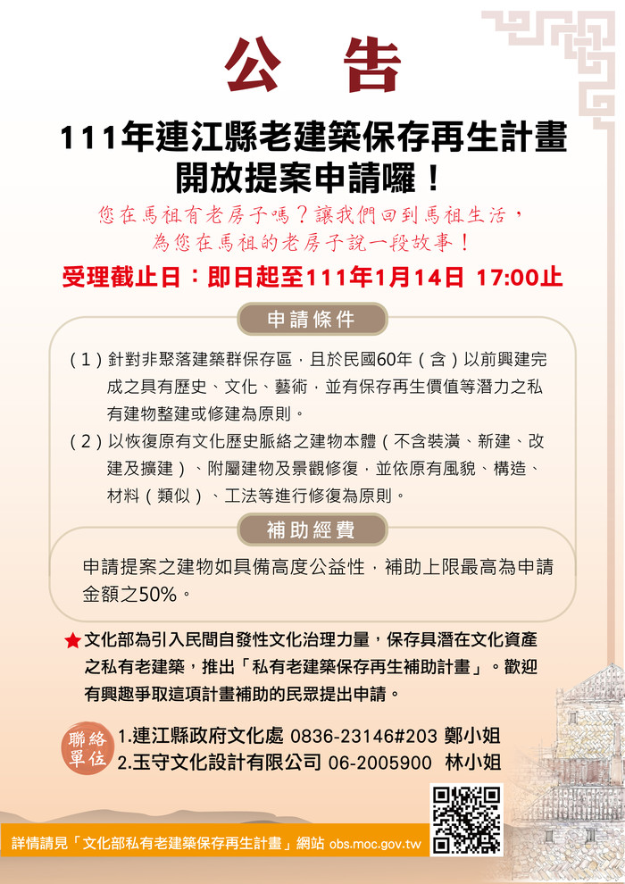 111年『連江縣老建築計畫申請囉!』 --閱讀人次 : 1534 文化部私有老建築保存再生計畫