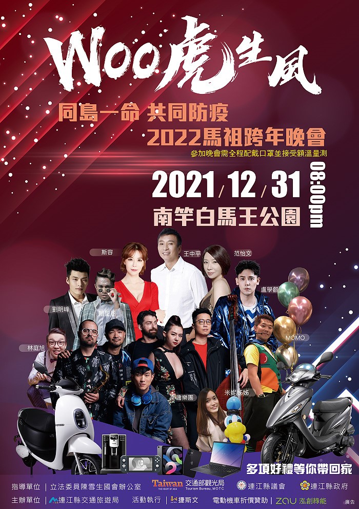 「Woo虎生風」2021-2022年馬祖跨年晚會31日晚間8時於白馬王公園(原介壽澳口公園)登場,由實力唱將王中平領銜范怡文、盧學叡、賴聖恩、劉明峰、中庸樂團等歌手熱力開唱,迎接嶄新的2022年。