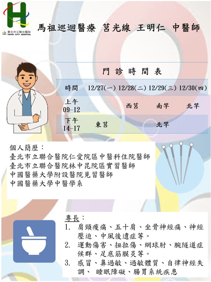 馬祖中醫巡迴醫療服務12/27-12/30由東引線 李維哲醫師、莒光線 王明仁醫師前往支援,請大家多多利用,看診時記得全程戴口罩喔!