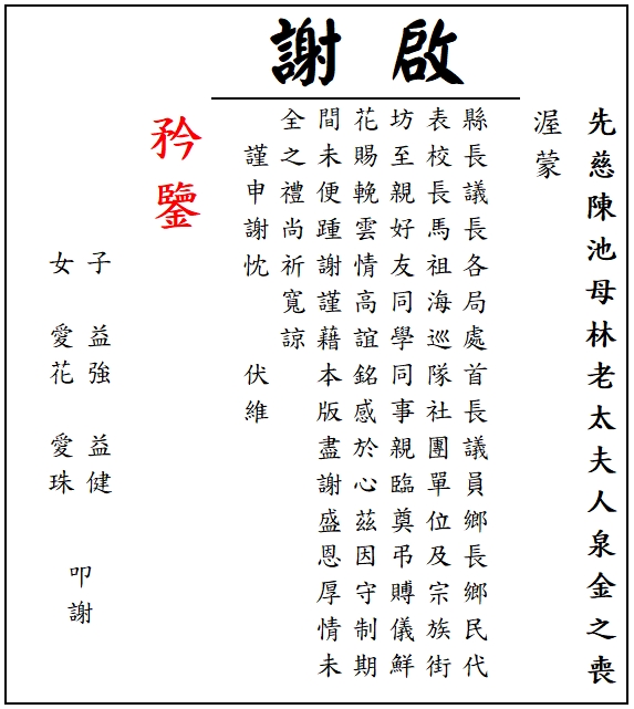 先慈陳池母林老太夫人泉金之喪謝啟