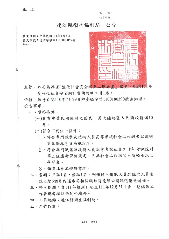 衛福局甄選1名約聘社工,詳如內文