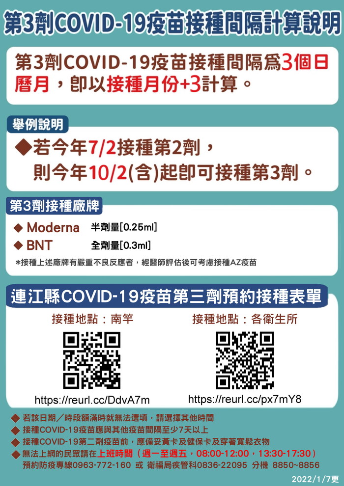 3.南竿鄉民眾已預約12日及19日的民眾,請依照原本預約時間前往接種,不需重新預約