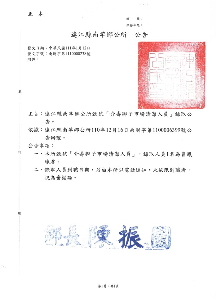 南竿鄉公所甄選市場清潔人員錄取公告