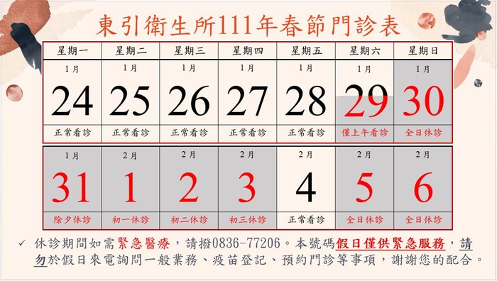 東引衛生所將於111年1月30日(小年夜,星期日)起連續休診,過年期間僅2月4日(初四,星期五)當天正常開診,並將於2月7日(星期一)起恢復正常門診時段,欲辦理相關行政業務或領藥的民眾,建議您提早辦理。