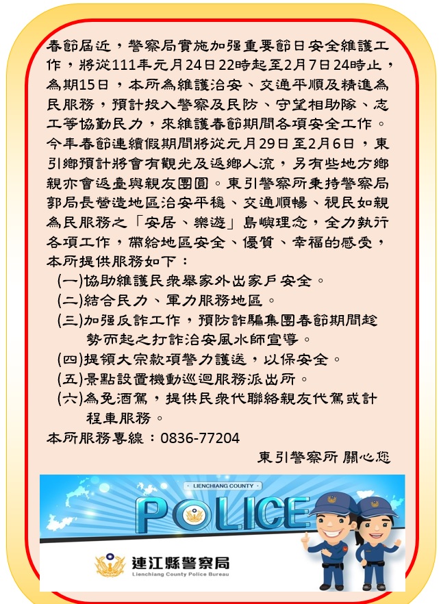 今年春節連續假期間將從元月29日至2月6日,東引鄉預計將會有觀光及返鄉人流,另有些鄉親亦會返臺與親友團圓。東引警察所秉持警察局郭局長營造地區治安平穩、交通順暢、視民如親為民服務之「安居、樂遊」島嶼理念,全力執行各項工作,帶給地區安全、優質、幸福的感受,提供服務如下:
