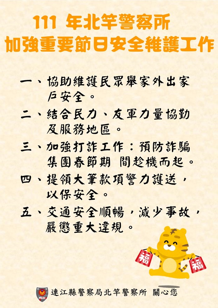 春節屆近,北竿警察所提醒鄉親無論在本轄或返臺遊憩務必注意自身安全。