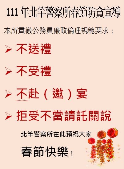 一、本所各級員警貫徹公務員廉政倫理規範要求,革除不當請託關說、贈受財物、飲宴應酬等陋習,不得參與不當邀宴,不收禮、不送禮,不接受任何餽贈、招待。