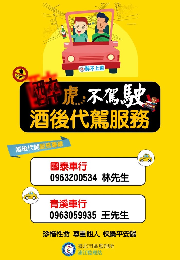 為降低酒後駕車而致交通事故,本站除持續宣導「酒後不開車」外,目前也推出酒後代駕服務,將人車安全送達目的地。參考資訊如下:
