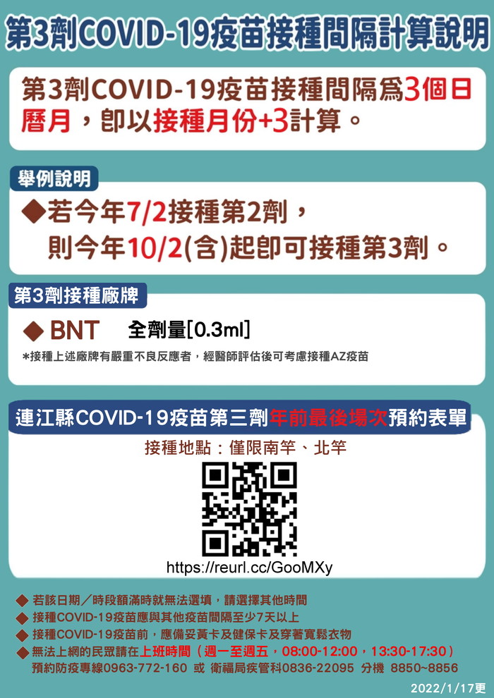網路預約表單於18日上午9點開放預約,網址為 https://reurl.cc/GooMXy ,符合三個月間隔的民眾請儘早完成預約;無法上網民眾可採電話預約,請於上班時間(週一至週五,08:00-12:00,13:30-17:30)撥打防疫專線0963-772-160或衛福局疾管科0836-22095分機8850~8856。來不及上網預約者,接種當天開放現場候補。
