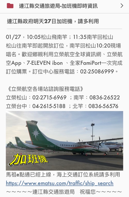 27日加班機 10:20南竿機場唱名