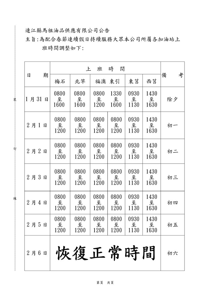 為配合春節連續假日持續服務大眾本公司所屬各加油站上班時間調整如下: