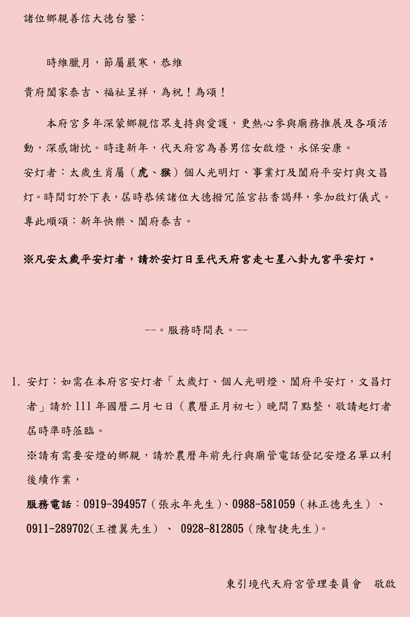 東引境代天府宮安太歲平安燈公告