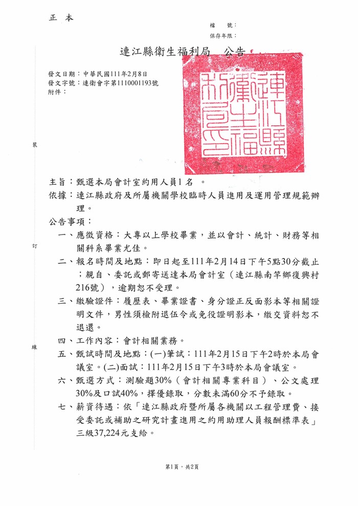 衛福局徵選會計約用人員