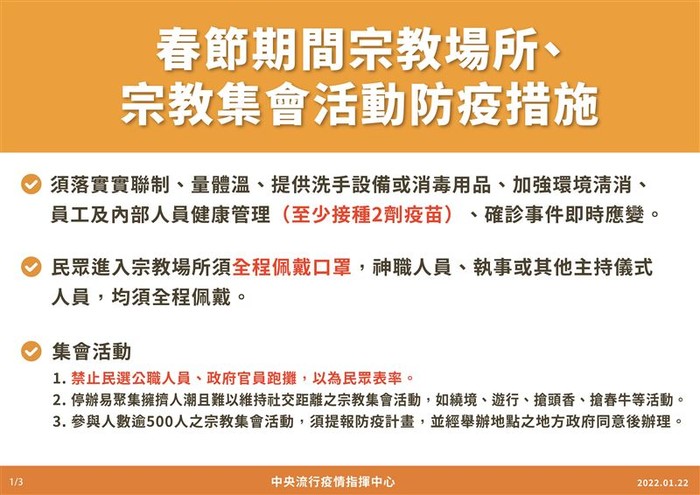 宗教團體至2月15日停辦繞境遊行活動 --閱讀人次 : 2216 內政部於1月22日宣布為防止疫情擴大,自即日起至2月15日,宗教團體停止辦理繞境、遊行、搶頭香、搶春牛等易聚集擁擠人潮、無法保持社交距離的集會活動,同時也不得提供籤筒、供盤供民眾使用,建議有相關需求的民眾自行攜帶筊杯、供盤等祭祀工具,此外民眾進入宗教場所也禁止飲食。