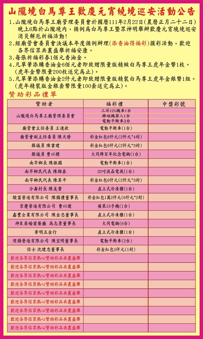 白馬尊王廟管理委員會於國曆111年2月22日(正月廿二日)