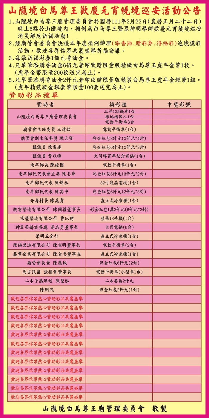 《添香油贈彩劵得福彩》山隴境白馬尊王巡安祈福摸彩活動,請洽介壽村辦公室,謝謝。