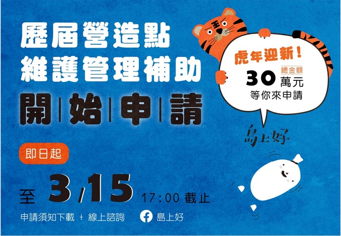 島上好‧歷屆營造點維護管理補助 申請開始囉! --閱讀人次 : 746 ‼️