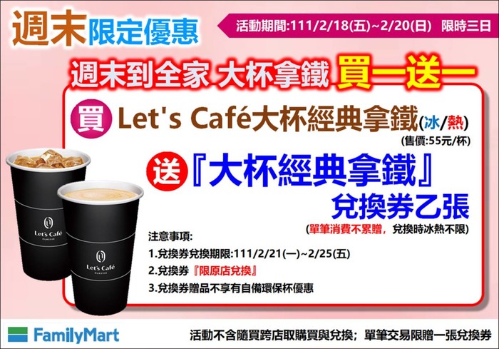 全家拿鐵買一送一只有三天