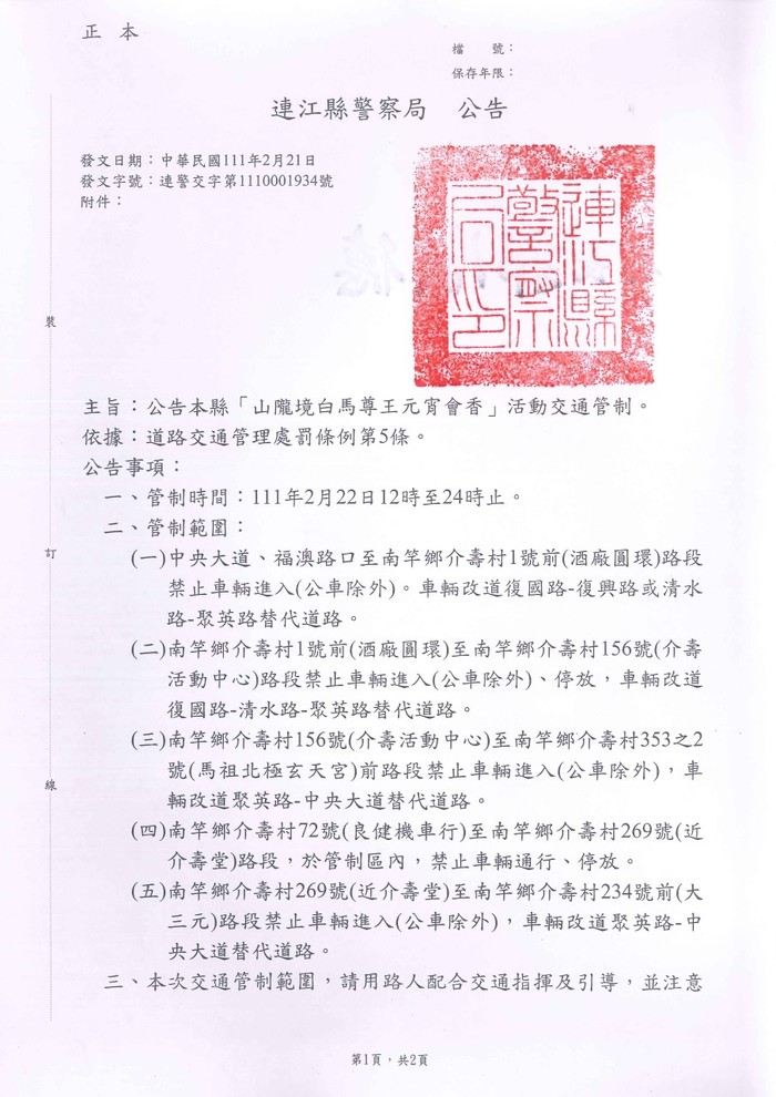 山隴境白馬尊王元宵會香活動將於111年2月22日舉行,請民眾於會香期間配合交通管制措施,以維護本縣交通秩序與安全。
