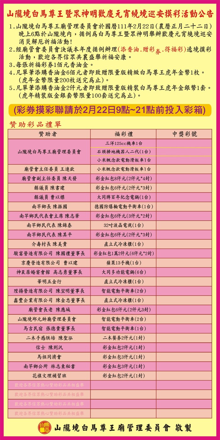 提醒通知;添香油贈彩券中大獎活動持續到晚上9點,彩券務必投入彩箱,四十多份大獎等著您