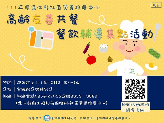 為了提升馬祖四鄉五島地區高齡友善環境,連江縣社區營養推廣中心推動社區長者據點、長者共餐單位及餐飲業者提供「衛生、均衡、美味」的餐食,誠摯邀請各單位一同加入餐飲輔導,共同邁向高齡營養新食代。